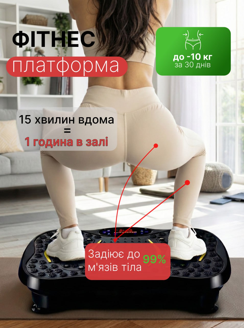 Віброплатформа — це домашній тренажер, який створює рівномірні вібрації для активації основних груп м’язів.Під час використання тіло отримує помірне навантаження, що сприяє підтриманню фізичної активності.Пристрій має 12 програм і 99 рівнів інтенсивності, що дозволяє налаштувати роботу під власні потреби.Пульт дистанційного керування допомагає зручно змінювати параметри під час тренування.LED-дисплей відображає час, режим і рівень вібрації для контролю процесу.Bluetooth-з’єднання дає можливість слухати музику або аудіокниги під час занять.